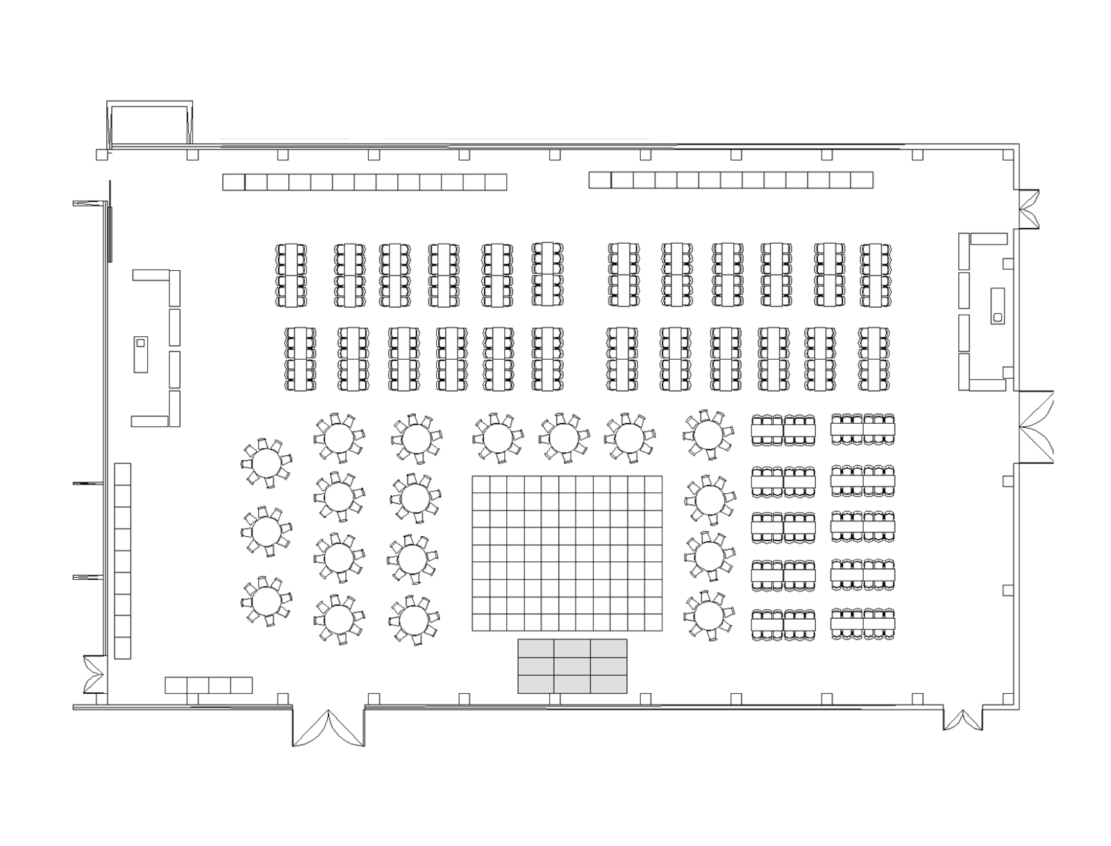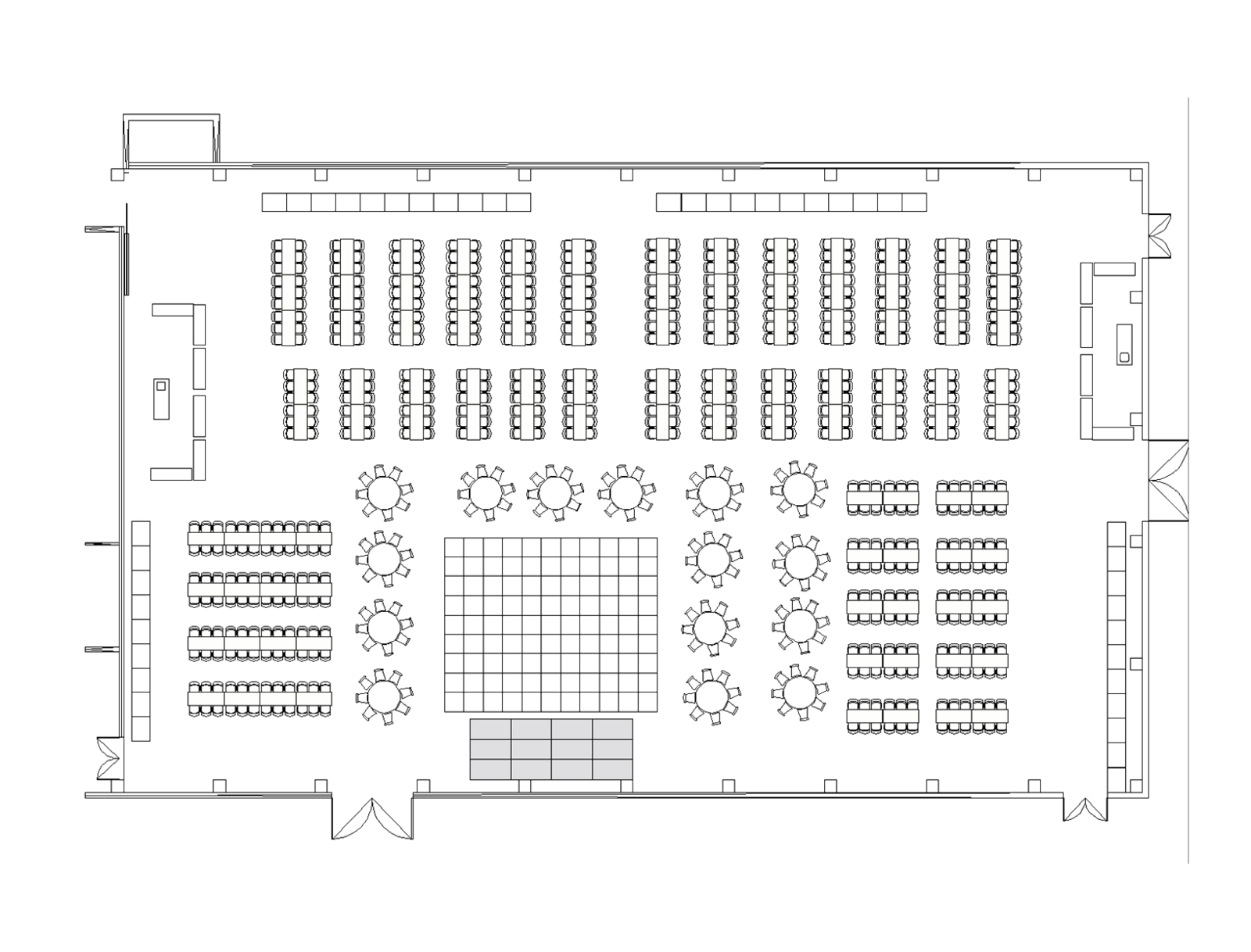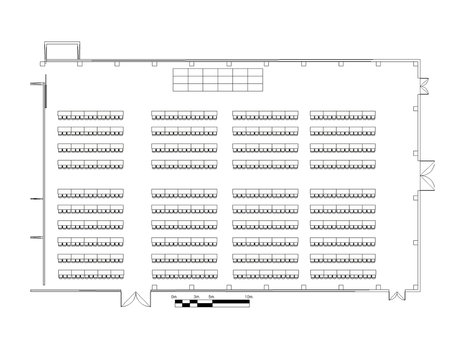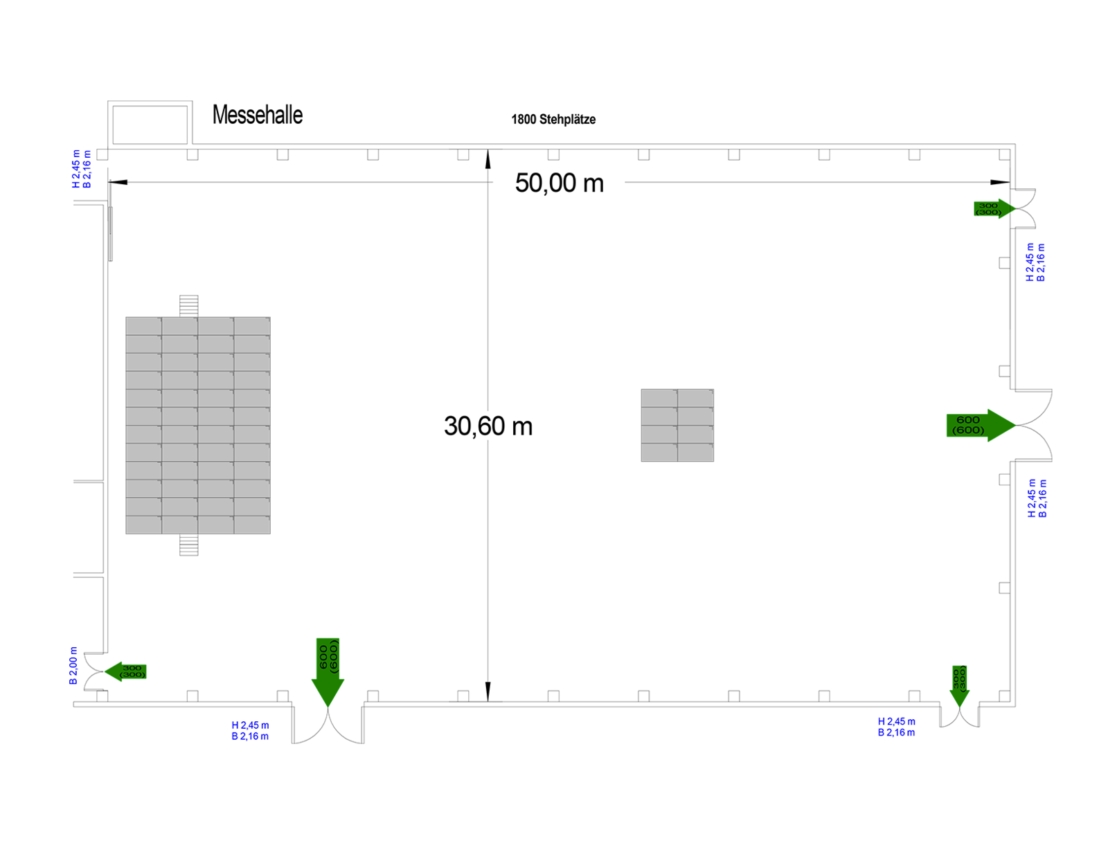 1 Hauptzugang, 1 Zugang zum Backstagebereich, 3 Zugänge nach draußen