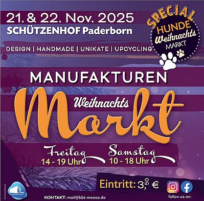 Der Manufakturen Markt ist eine wunderbare Gelegenheit, um besondere Vielfalt und Kreativität zu erleben. Bereits zum 6. Mal findet er am 21. & 22. November 2025 mit liebevoll gestalteten Unikaten, kreativem Handwerk, Spezialitäten und Design im stimmungsvollen Ambiente statt. Als Special wird zusätzlich der Hunde-Weihnachtsmarkt präsentiert!Euch erwartet eine bunte Mischung einzigartiger Produkte aus den Bereichen Design, Handmade, Schmuck, Kunsthandwerk, Mode, Dekoration, Feinkost, Kunst und Upcycling, sowie einzigartige & wertvolle Produkte für Eure Hunde.Ihr könnt Schönes und Nützliches für Euch & Eure Lieben entdecken, individuelle und außergewöhnliche Geschenke shoppen, euch in einer angenehmen Atmosphäre inspirieren lassen und besondere Label erleben.Man spürt, dass die Aussteller viel Liebe in die Herstellung ihrer Produkte gesteckt haben. Wer einzigartiges Design, detailverliebte Produkte und kreativ Handgefertigtes sucht, wird auf dem Manufakturen Markt fündig.Mit über 60 wunderbaren Ausstellern sagen wir: Herzlich Willkommen!Hunde haben freien Eintritt und sind an der Leine zu führen.